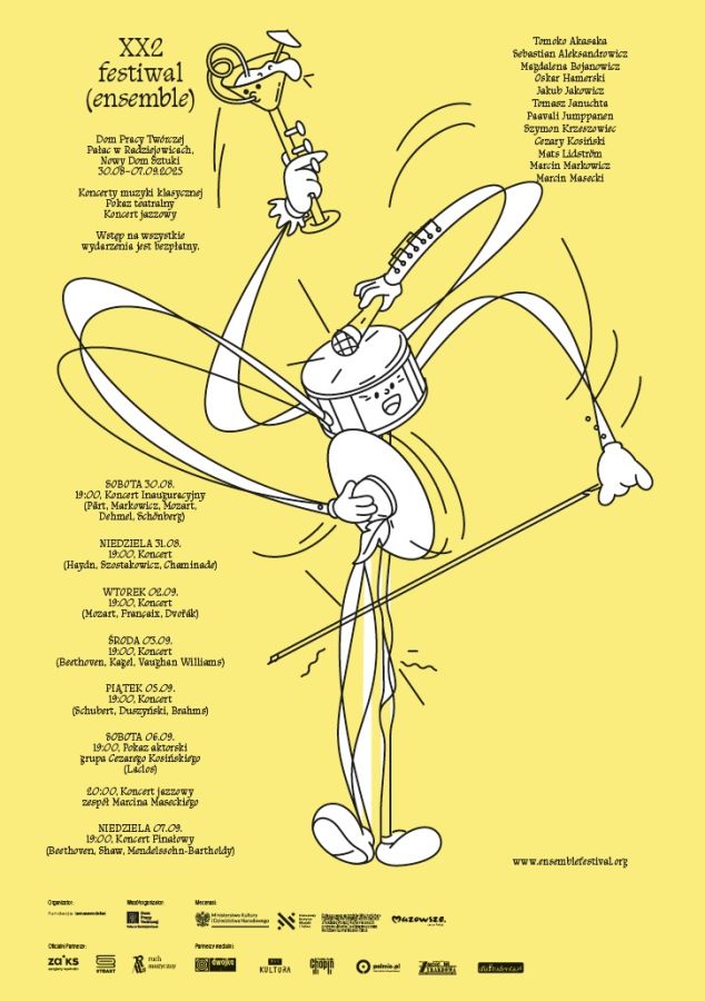 The 22nd Ensemble Festival will take place from August 30 to September 7, 2025, at the House of Creative Work – Palace in Radziejowice. The program will include four simultaneously held and mutually complementary elements: Chamber Music Interpretation Workshops (for classical musicians), Jazz Workshops, Acting Workshops, and a series of concerts and performances showcasing the joint work of young artists and professors. Admission to the concerts and the theatrical performance as part of the Ensemble Festival is free of charge.