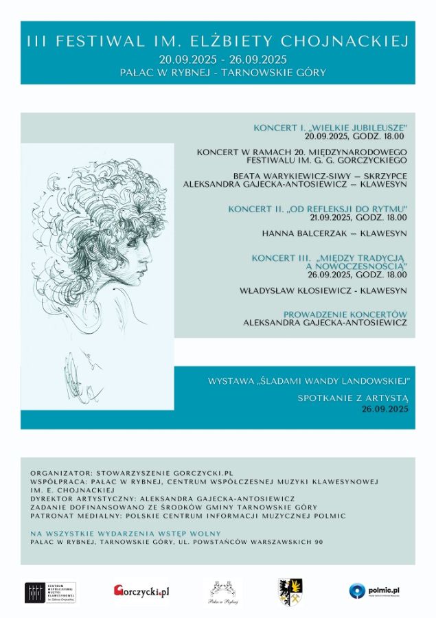 The 3rd Elżbieta Chojnacka Festival will take place at the Palace in Rybna (Tarnowskie Góry) from September 20–26, 2025. The event offers a unique opportunity to explore both historical and contemporary trends in harpsichord music, as well as the musical legacy of Elżbieta Chojnacka, whose passion and dedication to promoting harpsichord music continue to inspire generations of artists and listeners.