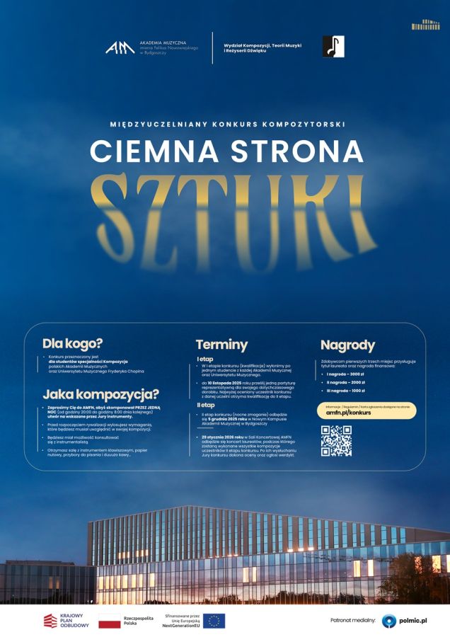 The Konsonans Foundation and the Faculty of Composition, Music Theory, and Sound Engineering of the Feliks Nowowiejski Academy of Music in Bydgoszcz invite you to participate in the 4th Intercollegiate Composition Competition “The Dark Side of Art.”