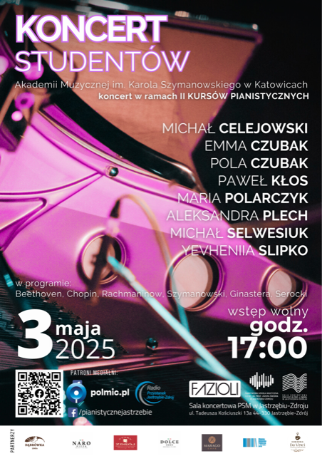 On May 3 at 5:00 PM, a concert will feature students from the Piano Department of the Karol Szymanowski Academy of Music in Katowice, performing works by Ludwig van Beethoven, Frédéric Chopin, Sergei Rachmaninoff, Karol Szymanowski, and Kazimierz Serocki. This event is a wonderful opportunity for a broad audience to experience both staples of the piano repertoire and lesser-known compositions.