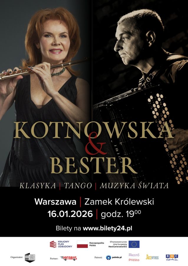 Flautist Jadwiga Kotnowska and accordionist–composer Jarosław Bester will perform as a duo in the Great Hall of the Royal Castle in Warsaw on 16 January 2026 at 7:00 p.m. Their recital for flute and accordion will present new arrangements of classical works, tango, jazz compositions, and contemporary music for this original instrumental combination.