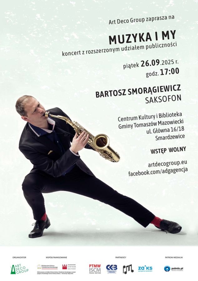 The second concert in the “Music and Us” series, organized by the Art Deco Group Music Agency, will take place on September 26, 2025, at 5:00 PM in Smardzewice, at the Cultural Centre and Library of the Tomaszów Mazowiecki Municipality. The program will feature contemporary chamber music performed by clarinetist, saxophonist, and composer Bartosz Smorągiewicz. The artist will also introduce selected works and invite the audience to join a collective improvisation. Contemporary chamber music offers a journey through the diverse and imaginative soundscapes of today’s composers. The Art Deco Group aims to bring these works to audiences in smaller towns, presenting new compositions for solo instruments. Participation is free of charge.