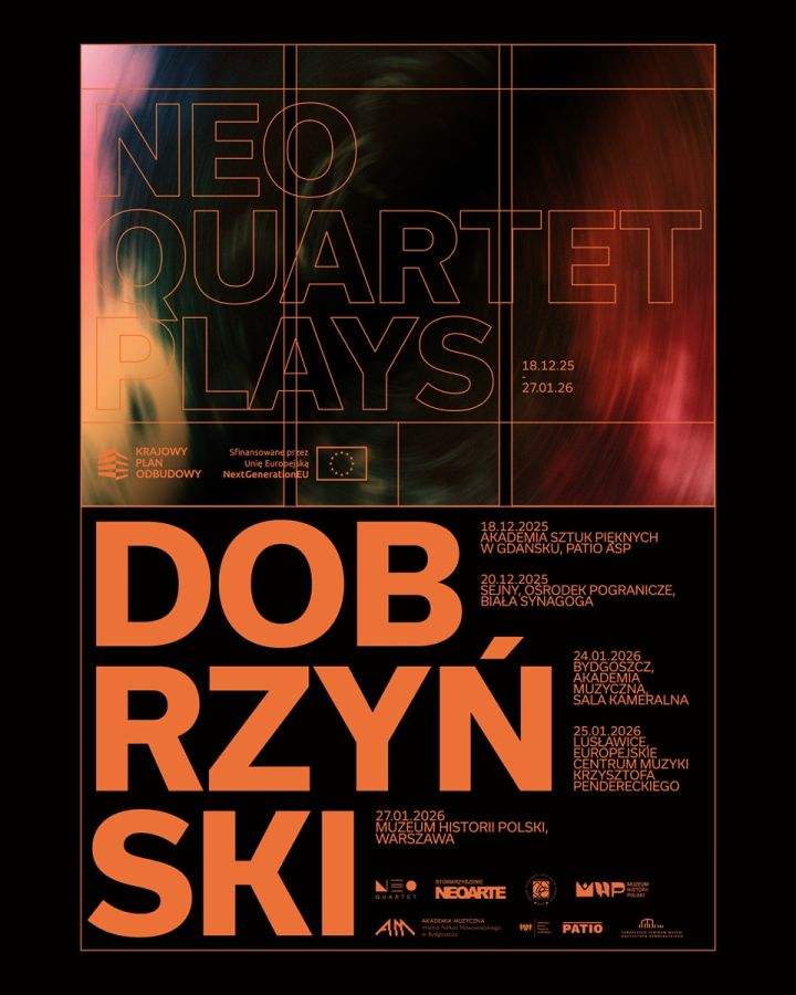 The multimedia concerts “NeoQuartet plays Dobrzyński” will take place, among other locations, in Bydgoszcz (Academy of Music), Gdańsk (Academy of Fine Arts Patio), Lusławice (Penderecki European Centre for Music), Warsaw (Museum of Polish History), and Sejny (Borderland Centre). An integral part of the project are visualizations created by Gdańsk-based visual artist Filip Ignatowicz, inspired by the works of Gero Hellmuth. Artificial intelligence (AI) will play a significant role in the creation of the visual layer of the concerts. Until March 15, 2026, the Museum of Polish History will host a temporary exhibition dedicated to this artist.