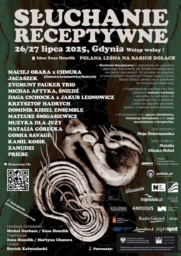 “Słuchanie Receptywne” (Receptive Listening) is a non-commercial, open-air festival of ambient and experimental music taking place from July 26 to 27, 2025, in a forest-and-sea setting — the Leśna Polana (Forest Glade) in Babie Doły, a district of Gdynia, Poland. Inspired by Pauline Oliveros’s concept of deep listening, the festival promotes conscious listening and a deeper understanding of how sound shapes both our environment and ourselves. The event lasts 24 hours — from 12:00 PM to 12:00 PM. Free admission!