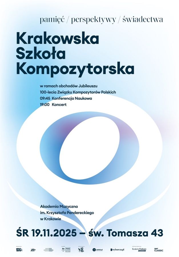 The Cracow Branch of the Polish Composers’ Union, together with the Krzysztof Penderecki Academy of Music in Cracow and the Centre for Documentation of Cracow Composers’ Works, invites you to the Scientific Conference and Concert held as part of the celebrations of the 100th anniversary of the Polish Composers’ Union. The event, under the theme “The Cracow School of Composition: Memory – Perspectives – Testimonies”, will take place on 19 November 2025 at the Academy of Music in Cracow. Admission is free.