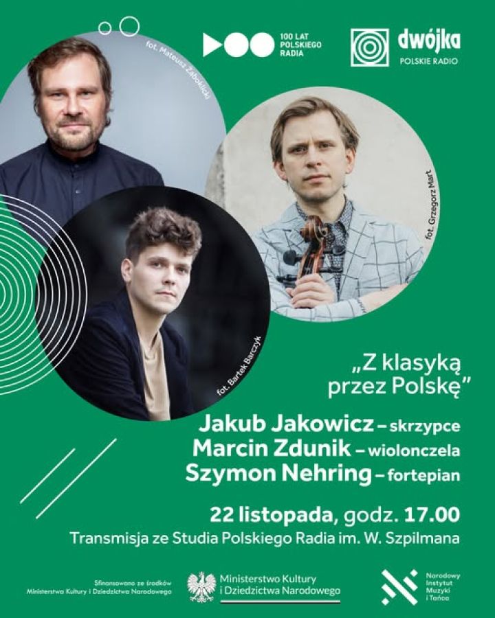 In the autumn edition of the series “With Classics Across Poland”, on 22 November 2025 at 5:00 p.m., a remarkable trio will perform at the Władysław Szpilman Studio of Polish Radio: pianist Szymon Nehring, violinist Jakub Jakowicz, and cellist Marcin Zdunik. The concert will be hosted by Klaudia Baranowska. Admission is free.
