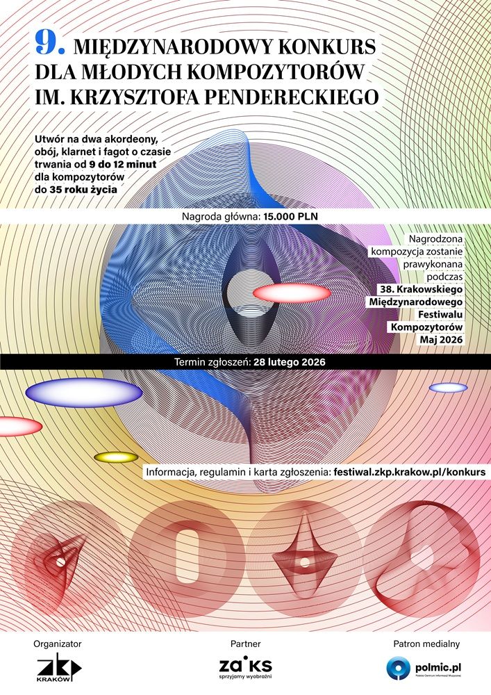 Związek Kompozytorów Polskich Oddział w Krakowie ogłasza 9. Międzynarodowy Konkurs dla Młodych Kompozytorów im. Krzysztofa Pendereckiego. Przedmiotem konkursu jest utwór na dwa akordeony, obój, klarnet i fagot o czasie trwania od 9 do 12 minut. Termin nadsyłania zgłoszeń upływa 28 lutego 2026 roku.