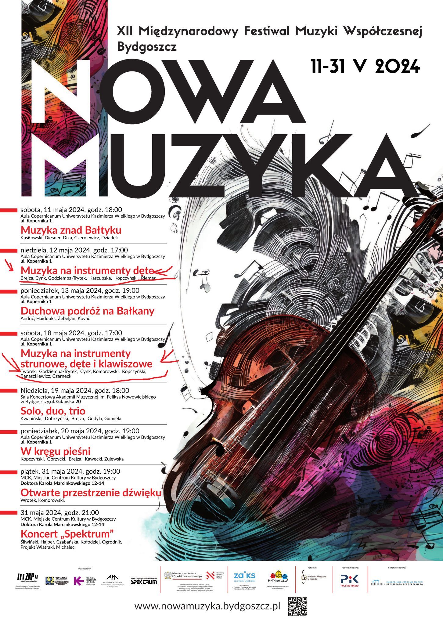 XII Międzynarodowy Festiwal Muzyki Współczesnej "Nowa Muzyka", organizowany przez Oddział Kujawsko-Pomorski Związku Kompozytorów Polskich, rozpocznie się 11 maja 2024 i potrwa do końca miesiąca. Program jest niezwykle bogaty i obejmuje: 8 koncertów, 57 kompozycji, 13 światowych prawykonań, występy ponad 50 muzyków z Polski i zagranicy. Koncerty odbędą się w trzech miejscach: Auli Copernicanum UKW, Sali Koncertowej AMFN na ul. Gdańskiej 20 oraz w Miejskim Centrum Kultury w Bydgoszczy. Wstęp na wszystkie koncerty jest bezpłatny!