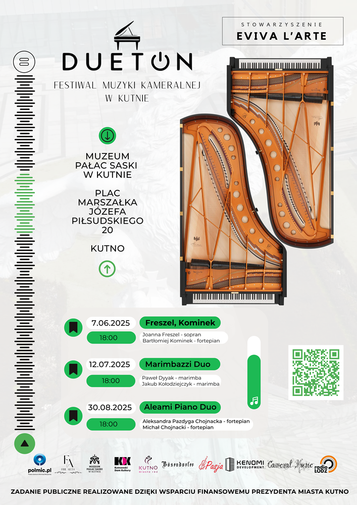 1. edycja festiwalu DuetON odbędzie się w dniach 7 czerwca - 30 sierpnia 2025 roku w wyjątkowej scenerii Muzeum Pałacu Saskiego w Kutnie. Ideą nowego festiwalu jest ukazanie siły muzycznego dialogu – w duecie, na równych prawach, z pasją i artystyczną wrażliwością. Stowarzyszenie Eviva l’Arte zorganizuje trzy koncerty - wszystkie o godz. 18:00. Wstęp wolny!