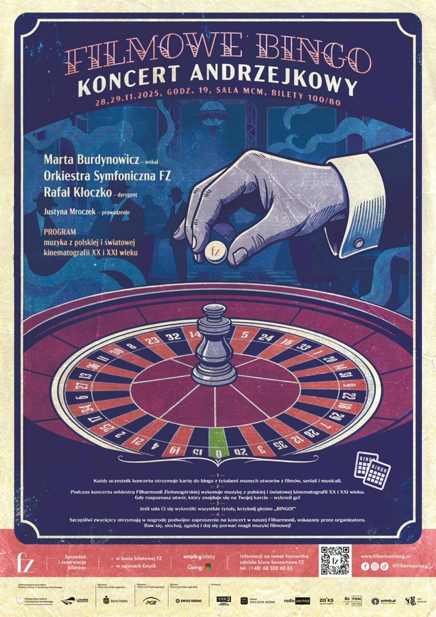 Filharmonia Zielonogórska zaprasza 28 i 29 listopada 2025 o godz. 19:00 na pełne emocji i wspomnień koncerty andrzejkowe "Filmowe Bingo”.