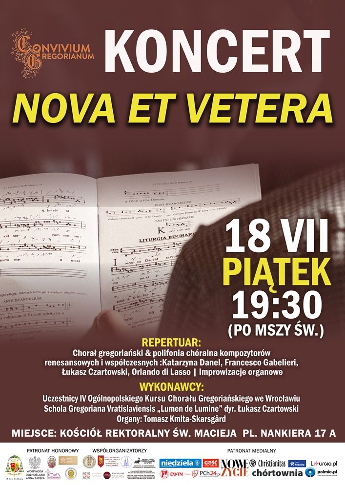 Podczas koncertu finałowego pt. "Nova et Vetera" zabrzmi chorał gregoriański i polifonia chóralna kompozytorów renesansowych i współczesnych. Schola Gregoriana Vratislaviensis pod dyrekcją Łukasza Czartowskiego w historyczno-religijnym centrum Wrocławia dokona koncertowego prawykonania Salve Regina Katarzyny Danel, zamówionego przez Fundację. Po raz pierwszy w Polsce zabrzmi Kyrie i Gloria z Missa cum Jubilo Francesca Gabellieriego. Uczestnicy Kursu zaprezentują również dzieła Orlanda di Lassa i Giovanniego Paolo Cimy w aranżacji do tekstu polskiego autorstwa Łukasza Czartowskiego. Improwizacje organowe na tematy gregoriańskie wykona Tomasz Kmita-Skarsgård.