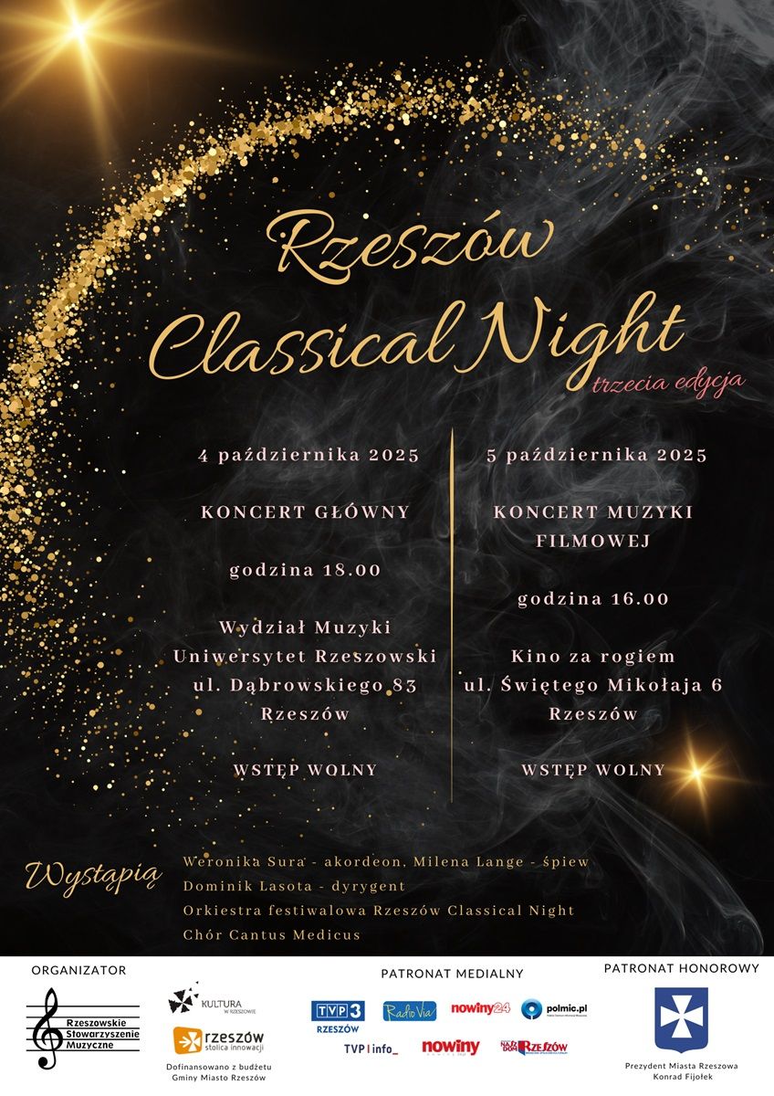 Rzeszowskie Stowarzyszenie Muzyczne zaprasza w dniach 4-5 października 2025 na trzecią edycję Festiwalu Rzeszów Classical Night, którego ideą jest prezentacja twórczości i wykonawców związanych z regionem rzeszowskim. Wstęp na koncerty jest wolny.