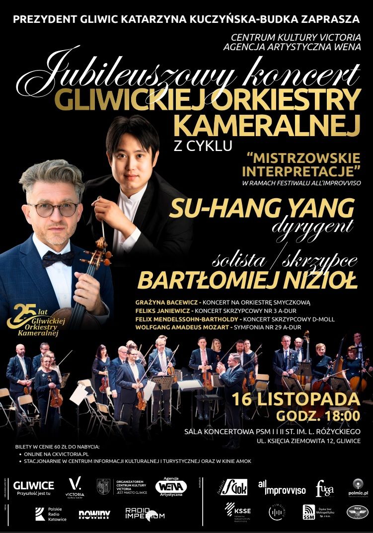 Agencja Artystyczna "WENA” oraz Centrum Kultury Victoria w Gliwicach zapraszają 16 listopada 2025 roku o godz. 18.00 do sali koncertowej Państwowej Szkoły Muzycznej I i II st. im. L. Różyckiego w Gliwicach, na doroczny koncert Gliwickiej Orkiestry Kameralnej z cyklu "Mistrzowskie interpretacje", który tym razem będzie głównym punktem obchodów Jubileuszu 25-lecia zespołu. Koncert odbędzie się w ramach festiwalu "All’Improvviso". W roli solisty usłyszymy Bartłomieja Nizioła.