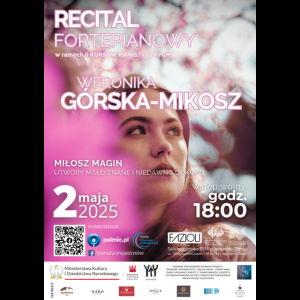 Podczas recitalu fortepianowego w wykonaniu Weroniki Górskiej-Mikosz 2 maja o godz. 18:00 usłyszymy mało znane i niedawno odkryte dzieła na fortepian Miłosza Magina. Weronika Górska-Mikosz - absolwentka katowickiej Akademii Muzycznej - w 2024 roku, jako laureatka Programu Stypendialnego "Młoda Polska" zrealizowała projekt nagrania i wydania płyty z muzyką fortepianową Magina.