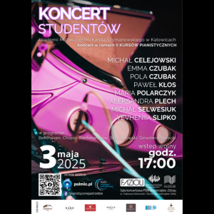 3 maja o godz. 17:00 odbędzie się koncert w wykonaniu studentów Katedry Fortepianu Akademii Muzycznej im. Karola Szymanowskiego w Katowicach. Zaprezentują dzieła L. van Beethovena, F. Chopina, S. Rachmaninowa, K. Szymanowskiego oraz K. Serockiego. Wydarzenie to jest doskonałą okazją dla szerokiego grona odbiorców do zapoznania się z dziełami należącymi do kanonu literatury pianistycznej oraz kompozycjami rzadziej prezentowanymi.