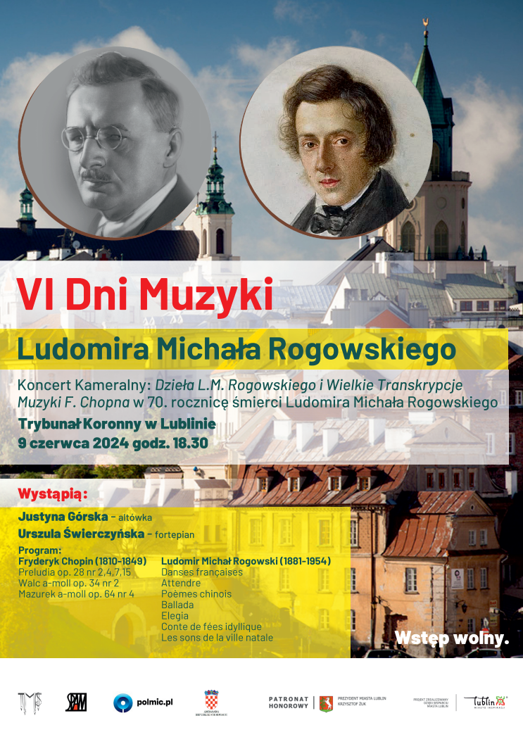 W ramach projektu "Dni Muzyki Ludomira Michała Rogowskiego", 9 czerwca 2024 w lubelskim Trybunale Koronnym o godz. 18.30, odbędzie się koncert kameralny "Ludomir Michał Rogowski im memoriam" w 70. rocznicę śmierci polsko-chorwackiego kompozytora. Justyna Górska (altówka) i Urszula Świerczyńska (fortepian) zaprezentują w większości niewydane utwory kameralne Ludomira Rogowskiego na altówkę i fortepian. Wstęp wolny!
