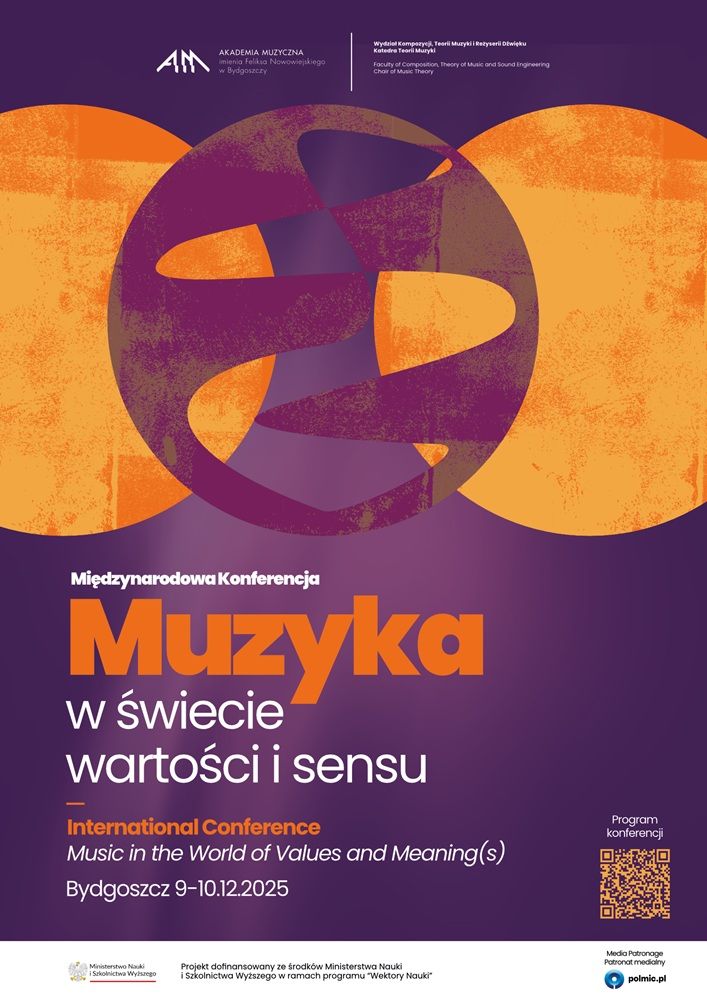 Katedra Teorii Muzyki Wydziału Kompozycji, Teorii Muzyki i Reżyserii Dźwięku Akademii Muzycznej im. Feliksa Nowowiejskiego w Bydgoszczy organizuje w nowym kampusie uczelni (Bydgoszcz, ul. prof. Jerzego Godziszewskiego 1) w dniach 9-10 grudnia 2025 Międzynarodową Konferencję "Muzyka w świecie wartości i sensu", której obrady transmitowane będą na kanale YouTube Akademii.