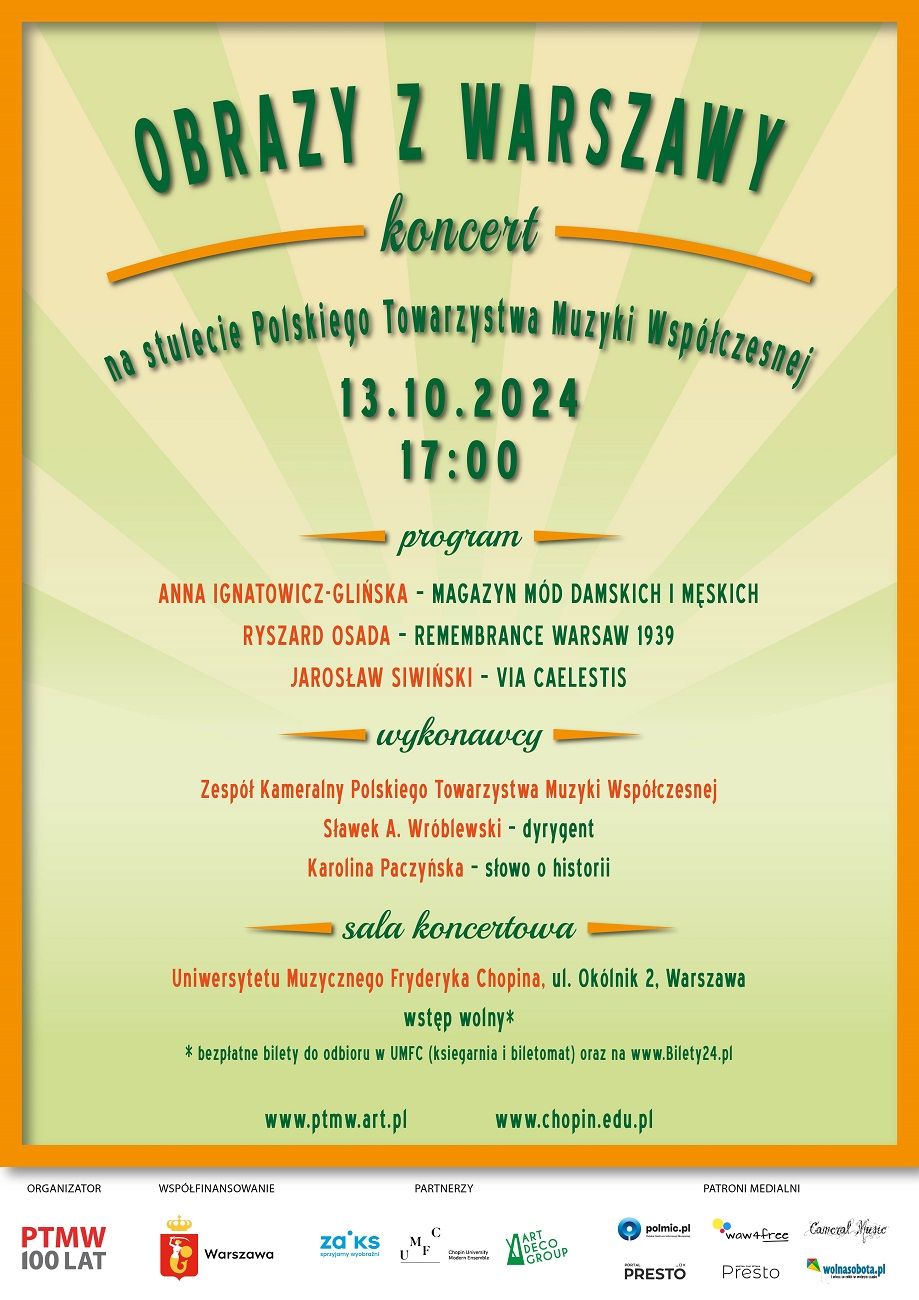 13 października 2024 o godz. 17:00 w sali koncertowej Uniwersytetu Muzycznego Fryderyka Chopina oraz 15 października o godz. 18:30 w Filharmonii Świętokrzyskiej Polskie Towarzystwo Muzyki Współczesnej, obchodzące w tym roku swoje 100-lecie, przedstawi jeden ze swoich najbardziej wyjątkowych projektów pt. "Obrazy z Warszawy". Kompozycje przywołujące stolicę już nieistniejącą - przedwojenną, niemal fantasmagoryczną - zaprezentuje Zespół Kameralny PTMW pod dyrekcją Sławka A. Wróblewskiego. Wstęp wolny.