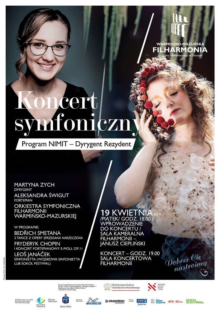 Trwa rezydencja dyrygencka Martyny Zych w Filharmonii Warmińsko-Mazurskiej im. Feliksa Nowowiejskiego w Olsztynie w sezonie 2023/24 w ramach programu Narodowego Instytutu Muzyki i Tańca „Dyrygent – rezydent”. 19 kwietnia o godz. 19.00 w Sali Koncertowej Filharmonii w ramach rezydencji odbędzie się koncert, na którym zabrzmi muzyka czeska i polska. W roli solistki wystąpi znakomita pianistka, wykładowczyni UMFC Aleksandra Świgut.