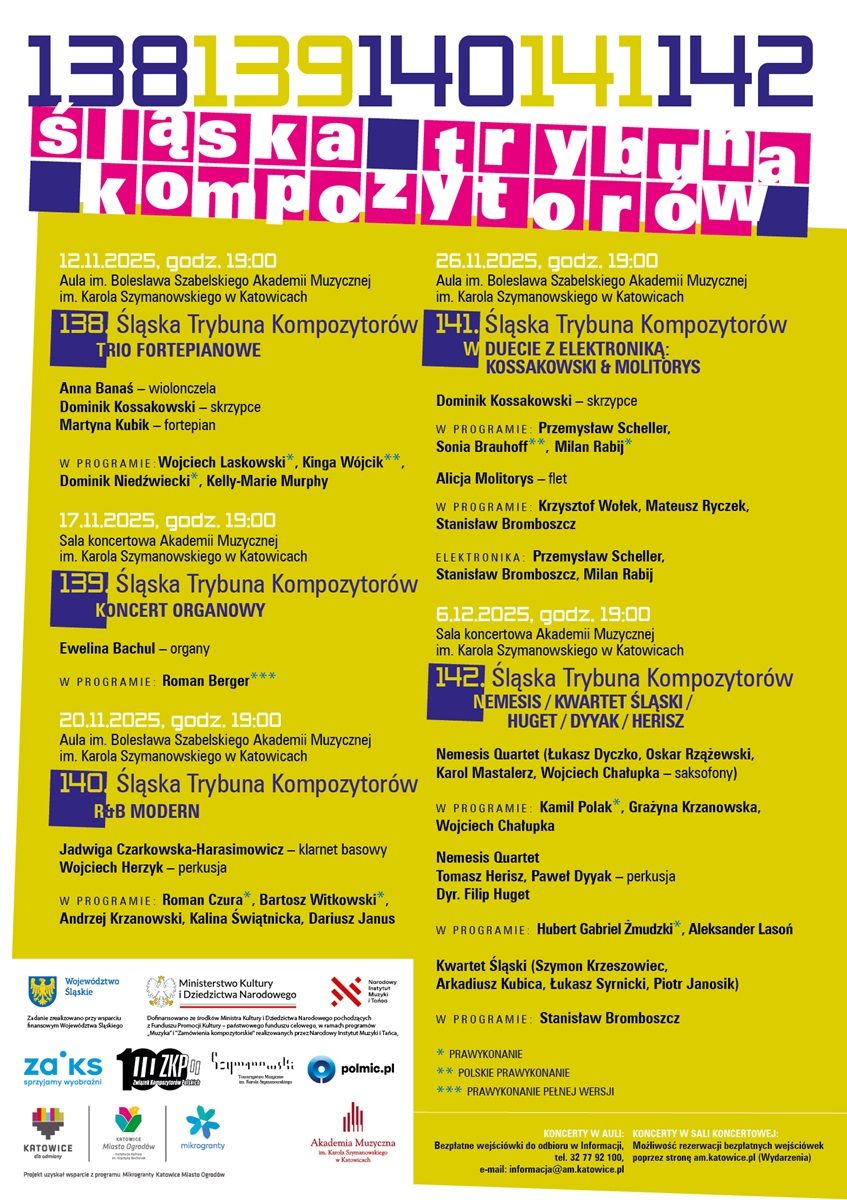 W dniach 12 listopada - 6 grudnia w Akademii Muzycznej im. Karola Szymanowskiego w Katowicach odbędzie się pięć koncertów w ramach Śląskiej Trybuny Kompozytorów 2025 – cyklu, który od ponad pół wieku dokumentuje, inspiruje i promuje twórczość kompozytorów związanych ze Śląskiem. W tym roku program Trybun jest wyjątkowo zróżnicowany – od utworów solowych po rozbudowane dzieła kameralne i kompozycje z elektroniką. Organizatorem cyklu jest Katowicki Oddział Związku Kompozytorów Polskich. Wstęp na wszystkie koncerty jest bezpłatny, ale obowiązują wejściówki.