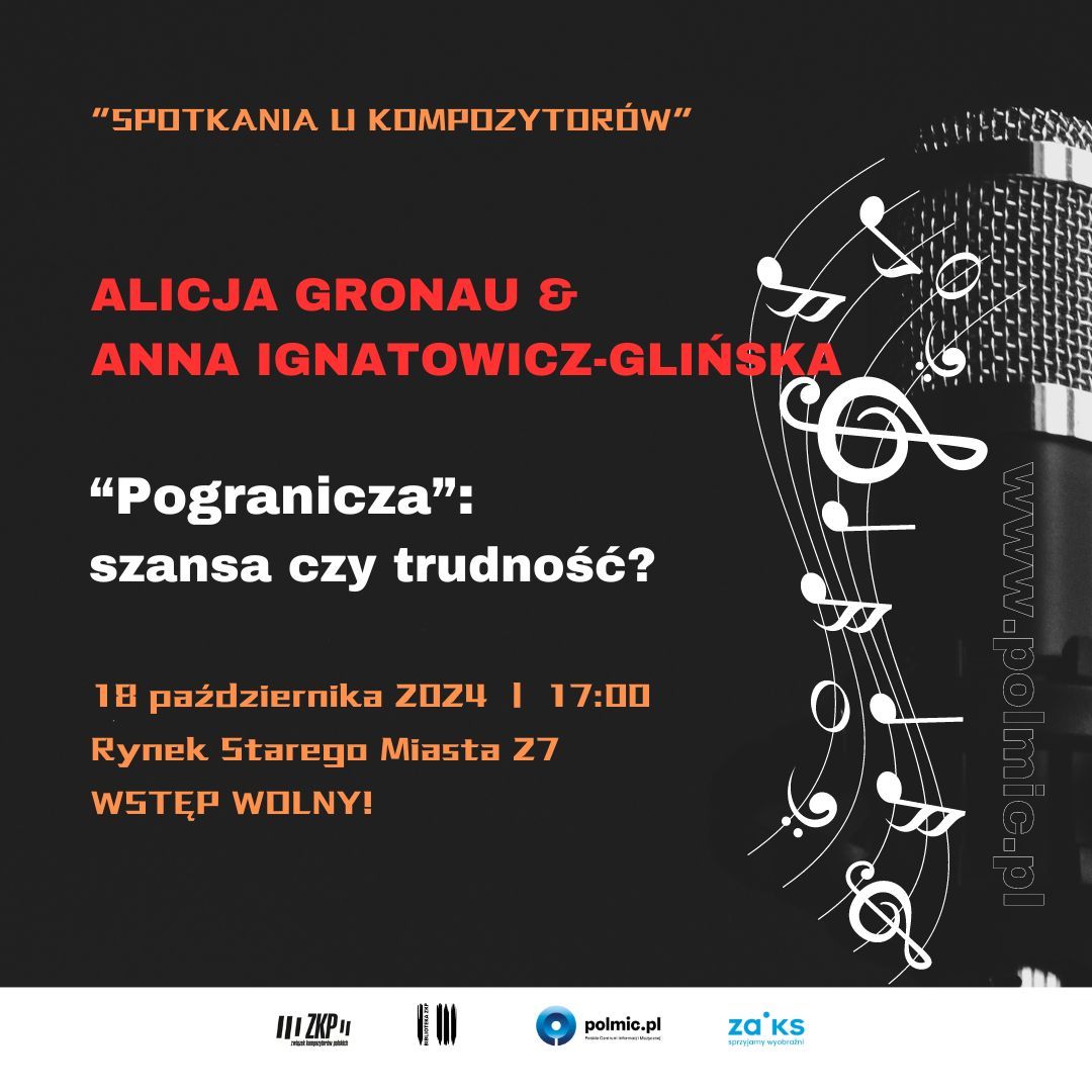 Związek Kompozytorów Polskich i Polskie Centrum Informacji Muzycznej POLMIC zapraszają na kolejne wydarzenie w ramach cyklu "Spotkania u Kompozytorów". "Pogranicza" - szansa czy trudność?" to temat spotkania 18 października 2024 o godz. 17.00 w siedzibie ZKP z dr hab. Alicją Gronau, prof. UMFC, i dr hab. Anną Ignatowicz-Glińską. Wstęp wolny!