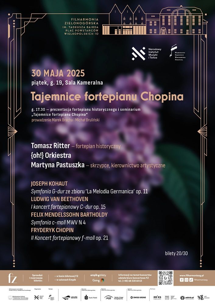W ramach cyklu koncertów laureatów Międzynarodowego Konkursu Chopinowskiego na Fortepianach Historycznych pianista Tomasz Ritter i {oh!} Orkiestra pod dyrekcją Martyny Pastuszki wystąpią w Filharmonii Zielonogórskiej im. Tadeusza Bairda 30 maja 2025 o godz. 19:00. Zanim rozpocznie się wieczorny koncert "Tajemnice fortepianu Chopina”, o godz. 17:30 w sali kameralnej odbędzie się prezentacja fortepianu historycznego i seminarium, poświęcone instrumentom Chopina, które poprowadzą pianiści dr Michał Bruliński i Marek Bracha. Czy autentyczna aura brzmieniowa fortepianów z czasów Beethovena i Chopina rzeczywiście posiada uzdrawiającą moc?