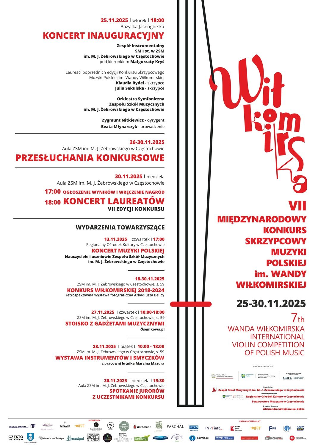 Zespół Szkół Muzycznych im. Marcina Józefa Żebrowskiego w Częstochowie zaprasza w dniach 25-30 listopada 2025 na koncerty w ramach VII Międzynarodowego Konkursu Skrzypcowego Muzyki Polskiej im. Wandy Wiłkomirskiej.