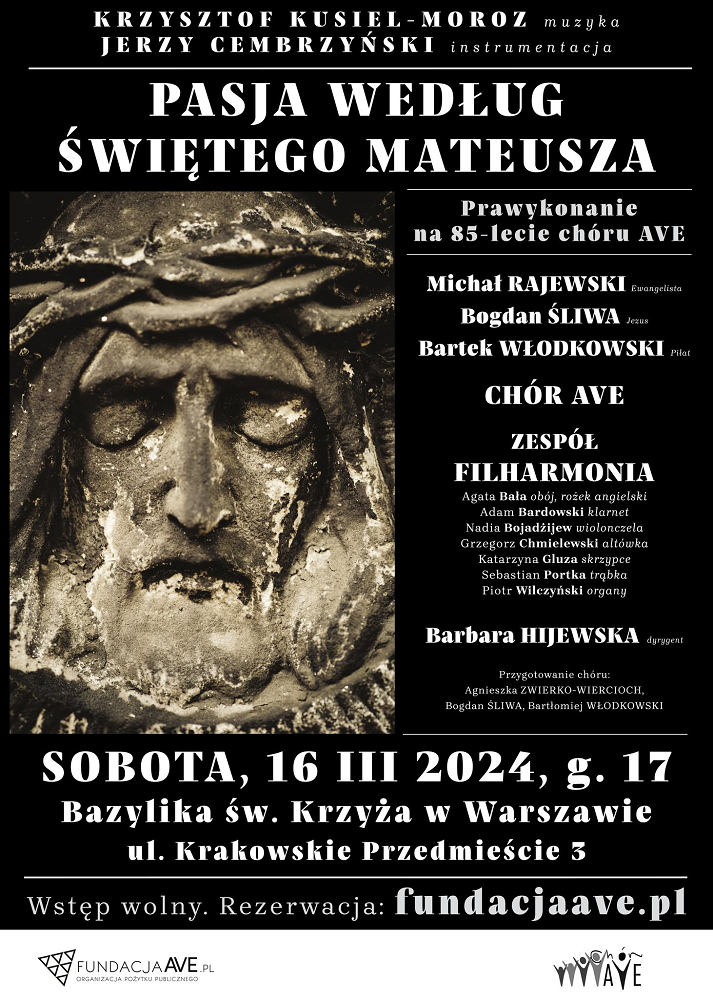 16 marca 2024 roku o godz. 17.00 w Bazylice Świętego Krzyża w Warszawie oraz w Niedzielę Palmową 24 marca o 19.15 w kościele Narodzenia NMP w Warszawie-Płudach przy ulicy Klasyków 21 odbędzie się prawykonanie Pasji według świętego Mateusza prof. Krzysztofa Kusiel-Moroza w opracowaniu Jerzego Cembrzyńskiego, laureata Grammy. Wystąpią znakomici soliści, chór AVE oraz muzycy Filharmonii Narodowej. Wstęp wolny!