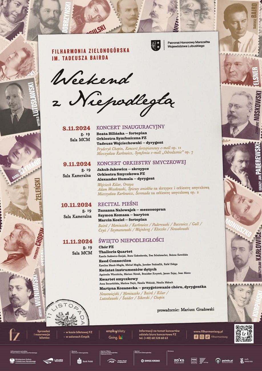 W dniach 8-11 listopada 2024 w Filharmonii Zielonogórskiej im. Tadeusza Bairda odbędzie się kolejna odsłona wyjątkowego, zapoczątkowanego w 2021 roku wydarzenia - "Weekendu z Niepodległą".