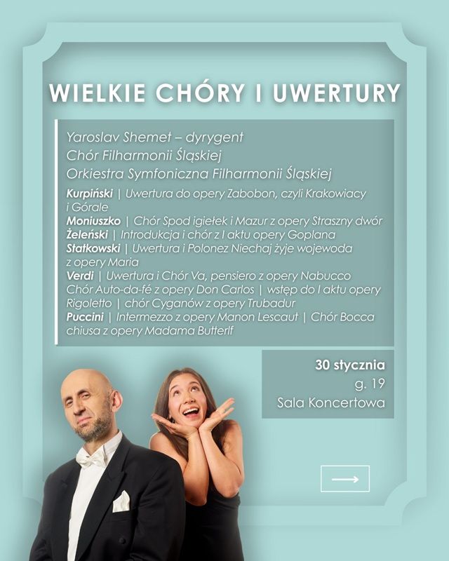 Chór i Orkiestra Symfoniczna Filharmonii Śląskiej pod batutą Yaroslava Shemeta zapraszają na wieczór pełen dramatyzmu, melodyjnego bogactwa i barwnej narracji operowej. 30 stycznia 2026 o godz. 19:00 zabrzmią chóry, uwertury i fragmenty instrumentalne z dzieł polskich i włoskich kompozytorów.