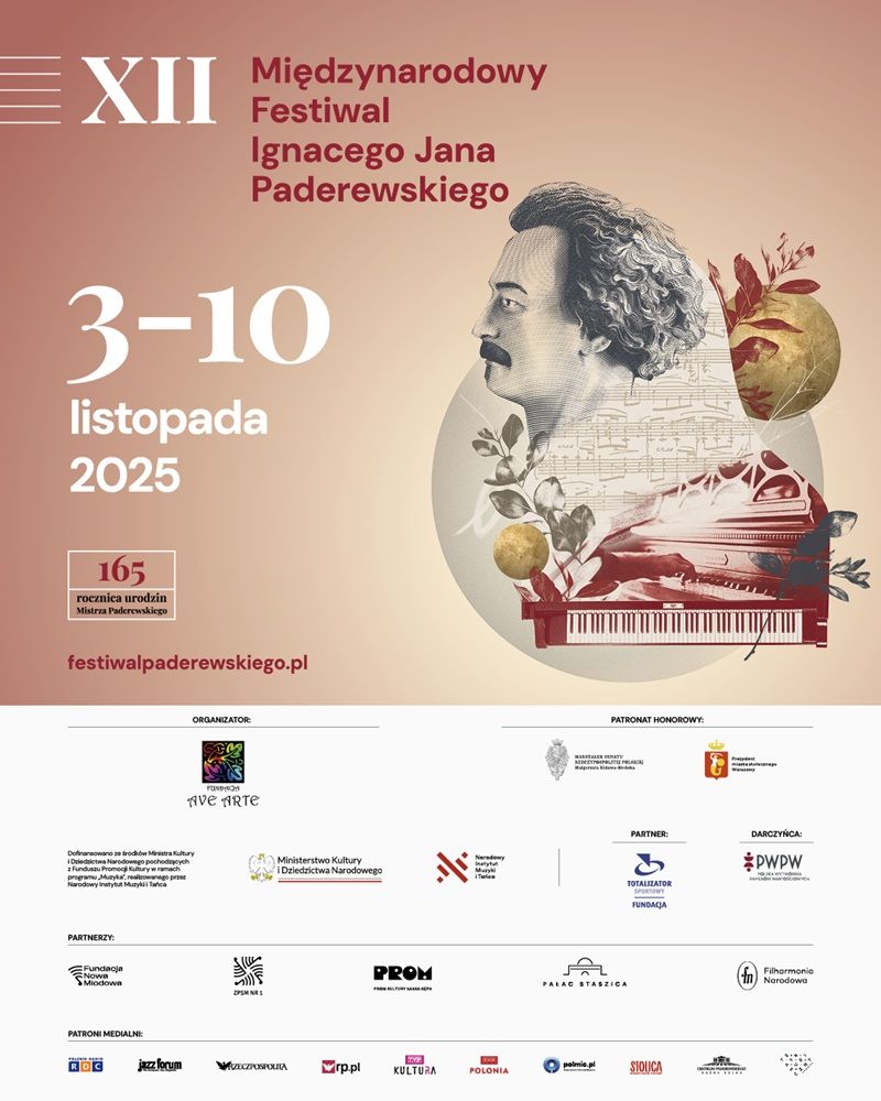 XII Międzynarodowy Festiwal Paderewskiego organizowany przez Fundację "Ave arte" odbędzie się w Warszawie w dniach 3-10 listopada 2025 i stanie się celebracją 165. rocznicy urodzin Patrona Festiwalu.