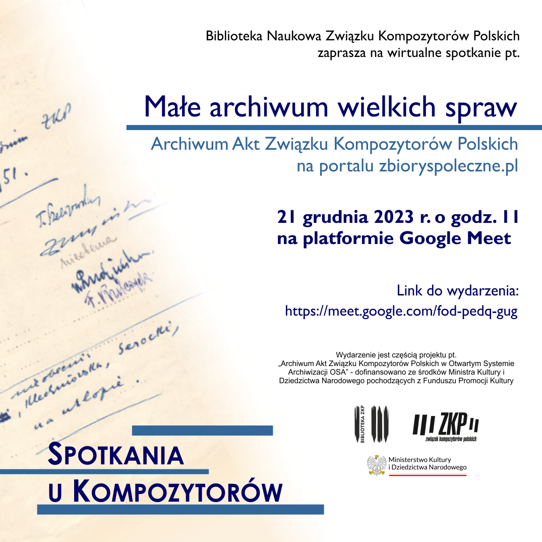 Biblioteka Naukowa Związku Kompozytorów Polskich zaprasza na spotkanie online pt. „Małe archiwum wielkich spraw. Archiwum Akt Związku Kompozytorów Polskich na portalu zbioryspoleczne.pl", które odbędzie się 21 grudnia 2023 roku o godz. 11.00 na platformie Google Meet. Spotkanie podsumowuje projekt „Archiwum Akt Związku Kompozytorów Polskich w Otwartym Systemie Archiwizacji OSA", który realizowano w tym roku dzięki wsparciu uzyskanemu w programie „Kultura cyfrowa". Pracownicy Biblioteki oraz zaproszeni partnerzy - Pan Piotr Maculewicz, kierownik Gabinetu Zbiorów Muzycznych BUW, i Pani Magdalena Borowiec, kustosz Archiwum Kompozytorów Polskich BUW - opowiedzą o owocach swojej współpracy.