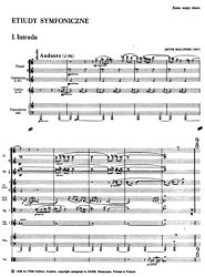 W powolnym wstępie (Andante) flet zarysowuje temat l Etiudy (Allegro), będącej rodzajem lekkiego scherza i bogato synkopowanej. Partia fortepianu ma miejscami charakter mazurkowy. Wyraźnie polska nuta dźwięczy w utrzymanej w wolnym tempie (Andante) II Etiudzie. Ciekawa rytmicznie jest III Etiuda, opierająca się na pięciodzielnym metrum ze zmiennym schematem 3+2 / 2+3. Szeroka kantylena skrzypiec na tle akordów fortepianu prowadzi do punktu kulminacyjnego w najszybszym tempie (prestissimo). Powolna IV Etiuda rozwija się w długooddechowych liniach melodycznych. Fortepian i orkiestra wspólnie osiągają punkt kulminacyjny, po czym temat pozostaje w orkiestrze. Uspakajające się z wolna wzburzenie rozpływa się w końcu w zanikającym pianissimo. Humorem, podkreślonym szczególnie przez prowadzone w małych sekundach głosy fagotów, odznacza się V Etiuda, krótka i zwarta. Rodzajem burleski jest VI Etiuda, zaczynająca się fugatem w instrumentach dętych, po którym temat podjęty zostaje przez fortepian; wprowadza on również drugi, bardziej śpiewny temat. Z pełnobrzmiącej orkiestry na pierwszy plan wysuwa się kwintet smyczkowy, rozwijając szeroko rozpiętą kantylenę na tle akordów fortepianu. Następuje z kolei bogato zinstrumentowana i „gęsta” harmonicznie partia, oparta na pierwszym temacie, która przechodzi w Kodę. W Kodzie zwraca uwagę ciekawe i rzadko spotykane zestawienie fortepianu z różnymi instrumentami perkusyjnymi, przy czym fortepian w niskich rejestrach podtrzymuje (tremolo) temat, grany przez ksylofon. Rytmiczne zagęszczenie w triolach poprzedza końcowe akordy fortepianu i orkiestry. (sh)